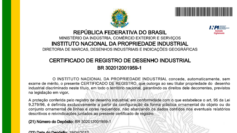 Possuímos certificado de registro de desenho industrial,